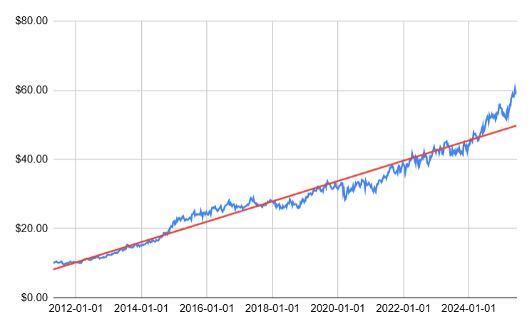 As of June 2025, a linear regression model on 14 years of XST timeseries data produces an r-squared of 0.96, indicating a strong upward growth trend in this ETF with 96% of its price variations explained simply by the passage of time. Keep in mind however, that past performance does not necessarily guarantee future trends will continue the same way.